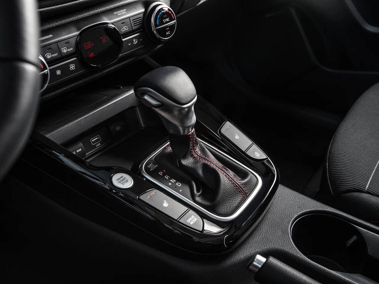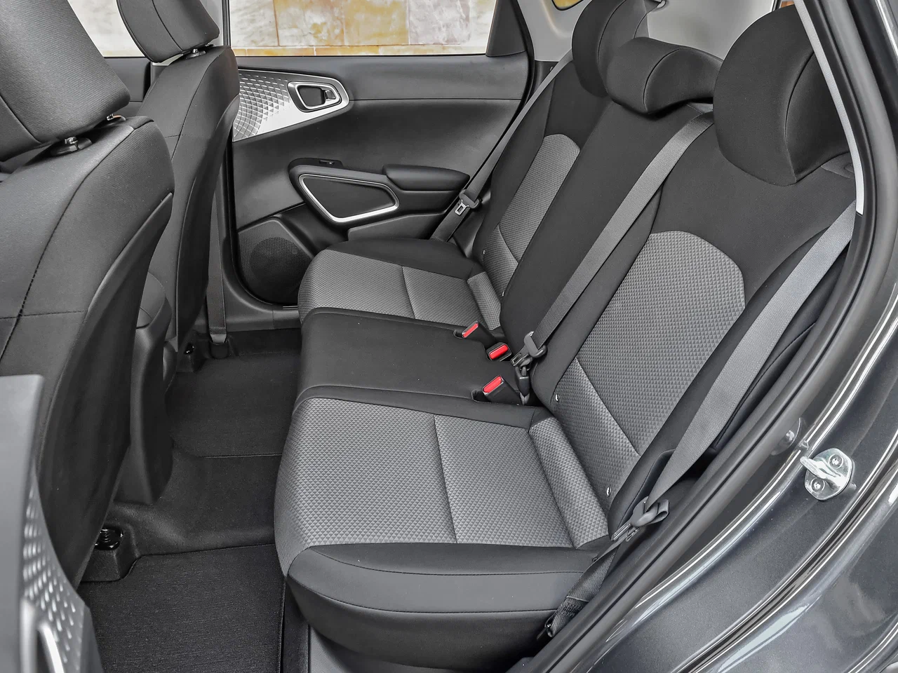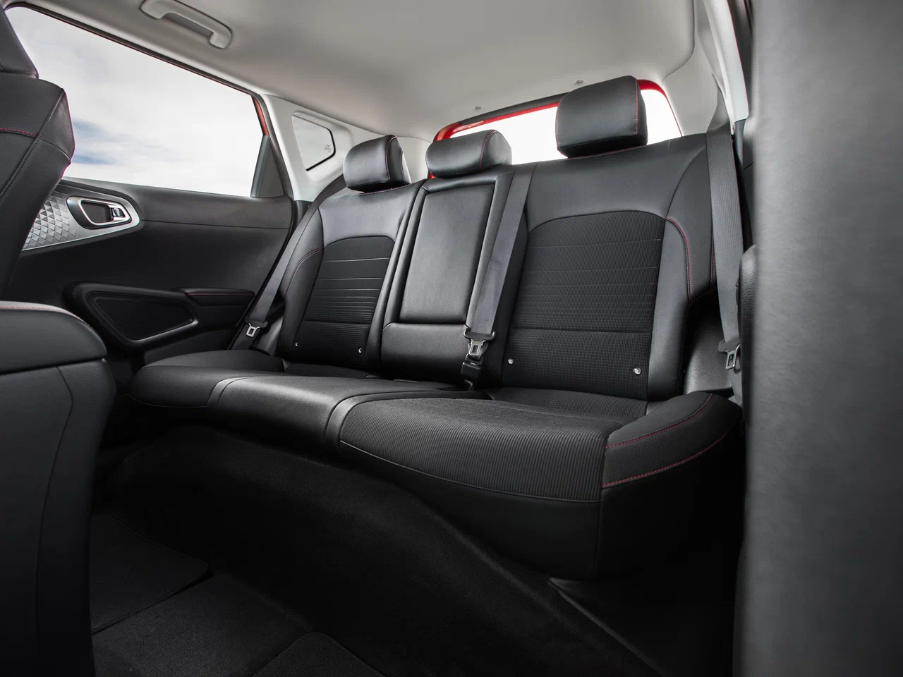 Комбинированная отделка сидений из кожи и ткани с красной прострочкой